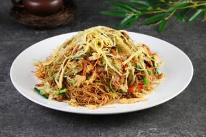 炒粉干時,根據粉干的吸水性,適量加入水分,炒粉干的水分不宜過多,以免結塊。